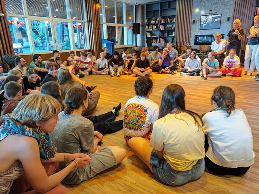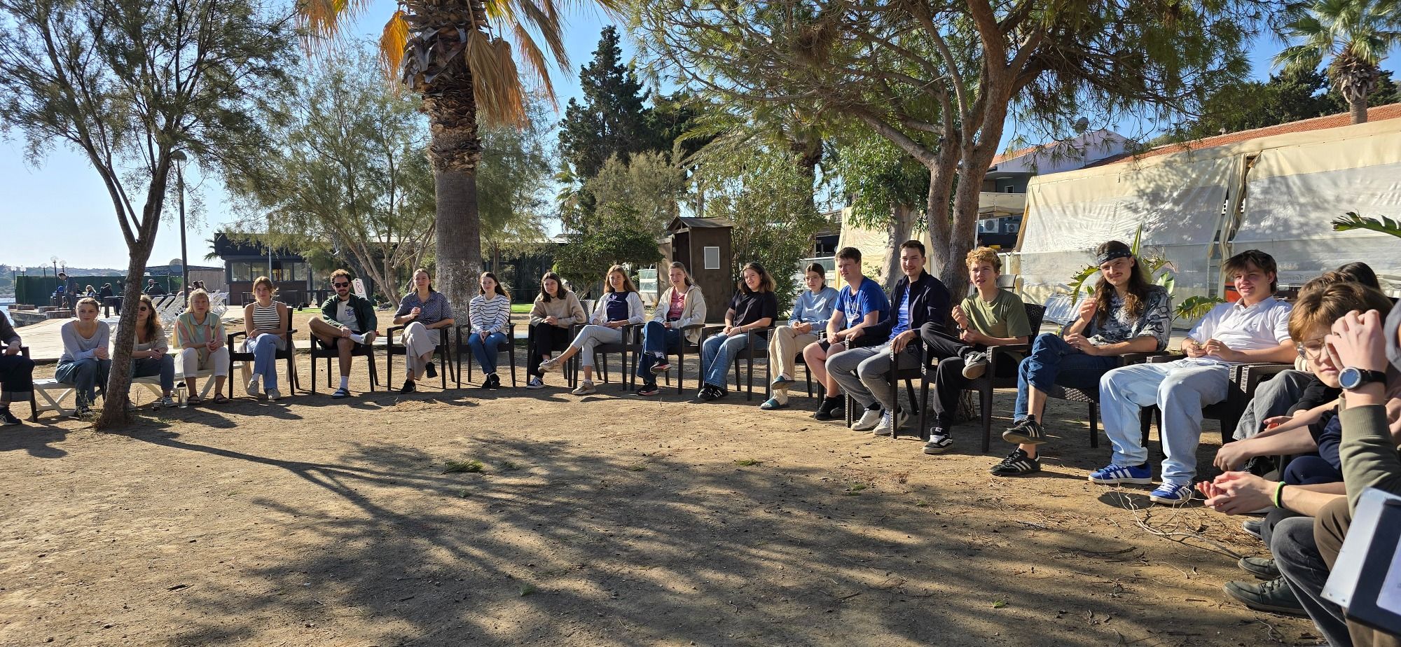 Nach dem Frühstück kamen alle draußen am Meer zur großen Gesprächsrunde zusammen. Am ersten Tag stand das Kennenlernen im Mittelpunkt. Studierende der Pädagogischen Hochschule Freiburg brachten ihre Erfahrungen aus der Theaterpädagogik ein und leiteten nonverbale und rhythmische Spiele an, die mit viel Bewegung, Humor und Energie die gesamte Gruppe zusammenführten. Ein liebevolles Ritual war der Austausch kleiner Gastgeschenke, die in einem spielerischen Format untereinander verteilt wurden.