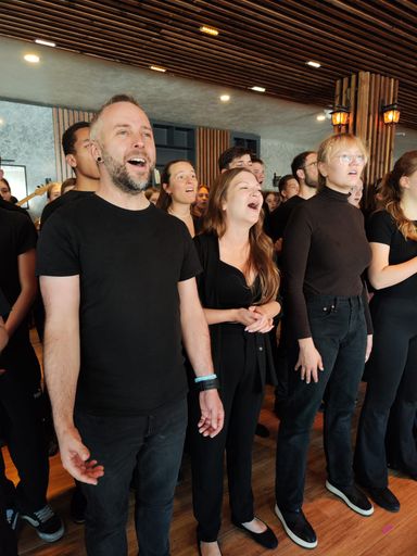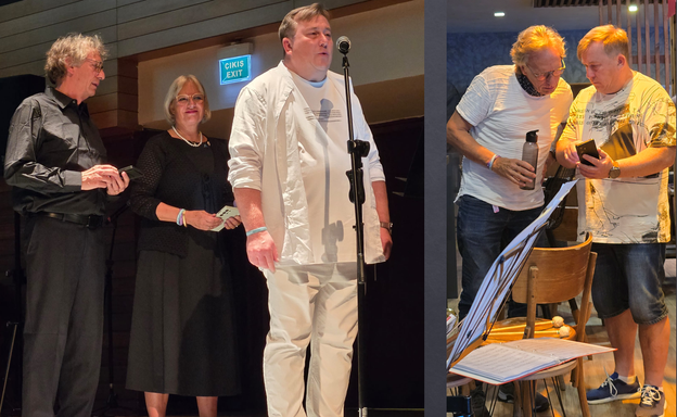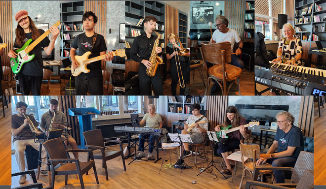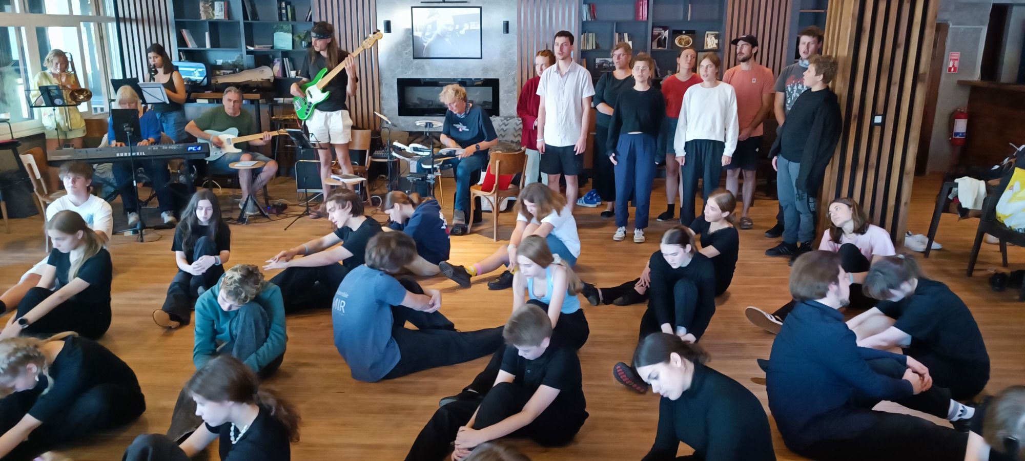 Nach der Gesprächsrunde begannen die Proben im leergeräumten Frühstücksraum. Intensive Stimmbildungsübungen leiteten das Singen der Songs ein. Da alle Teilnehmer im Vorfeld das Notenmaterial und die Audios der Song zur Verfügung hatten, waren sie auch gut vorbereitet und es konnten die mehrstimmigen Feinheiten gearbeitet werden. Dazu gehörten auch die Arrangements der Band, deren Kerntruppe Keyboard, Gitarre, Bassgitarre Drums durch Bläser und Geigen ergänzt wurden.