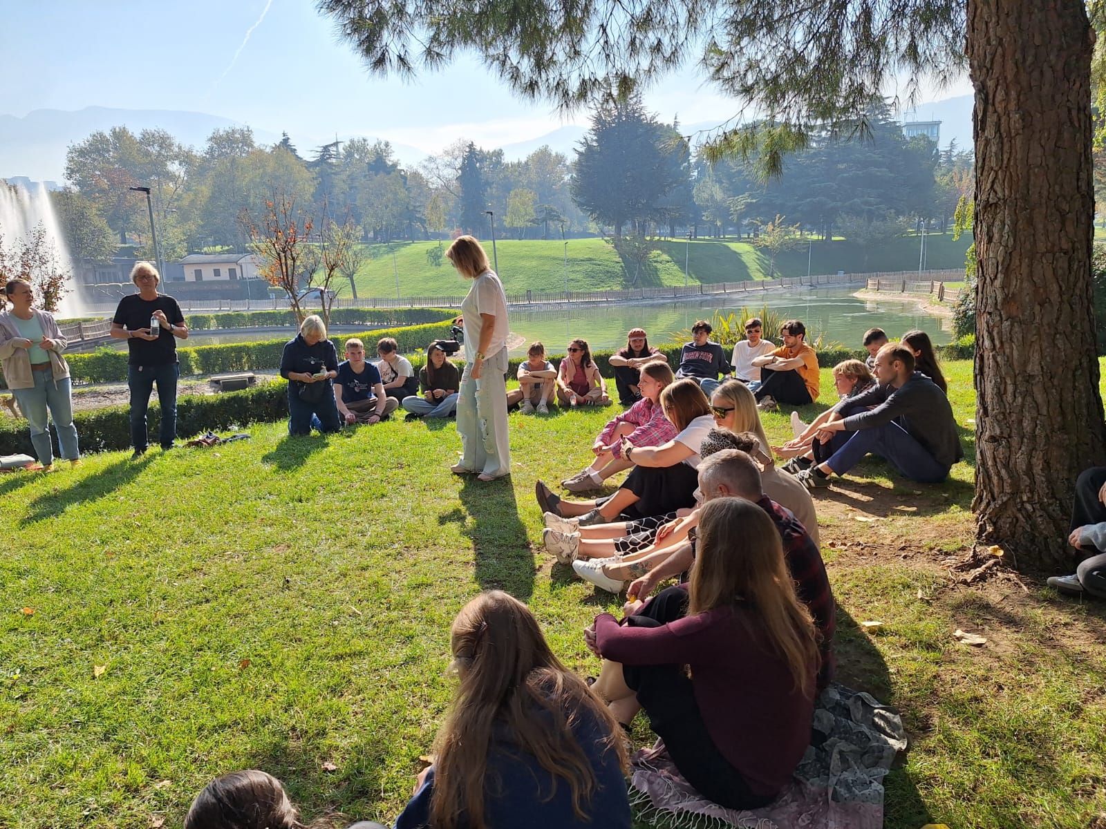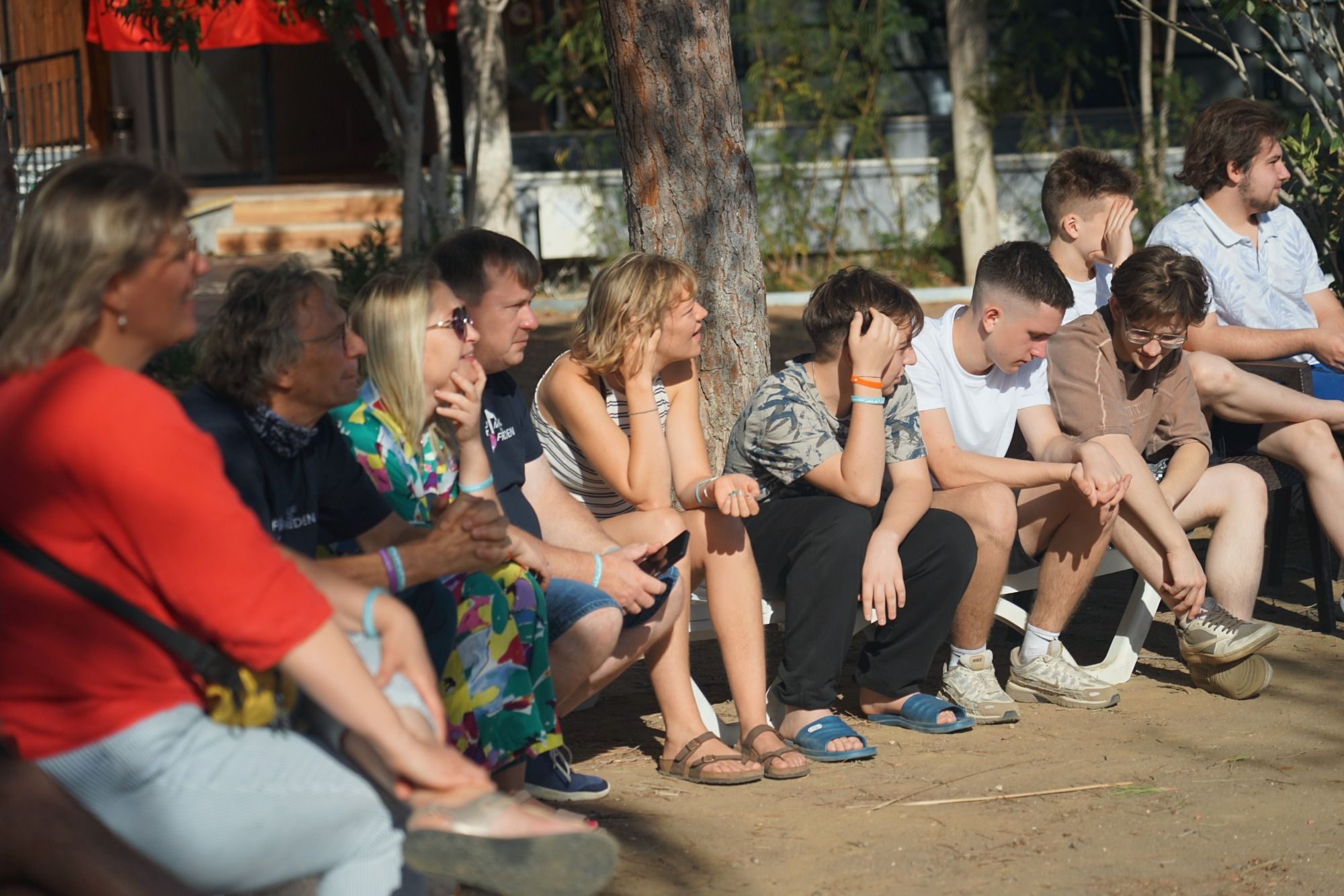 Nach dem Frühstück trafen sich die 50 deutschen, russischen und internationalen Teilnehmer zum großen Gesprächskreis unter den Palmen. Zum Auflockern wurden durch unsere Pädagogikstudentinnen und -studenten aus Freiburg einige rhythmische und musikalische Spiele angeleitet. Die waren entweder nonverbal oder sprachlich so einfach, dass alle ohne Schwierigkeiten mitmachen konnten. Die Stimmung untereinander wurde fröhlich und beschwingt und es war ein guter Einstieg für die Gesprächsrunden. Die Inhalte der Gespräche waren allerdings sehr ernsthaft, wir sprachen über die aktuelle Situation und wie jeder mit seinen Ängsten und Befürchtungen umgeht. Was können wir als junge Menschen tun? Es wurden auch persönliche Zukunftsausblicke und Hoffnungen geäußert. Das Politische blieb außen vor. Die Redebeiträge wurden von Ksenija und Veronika ins Deutsche, Russische und Englische übersetzt.