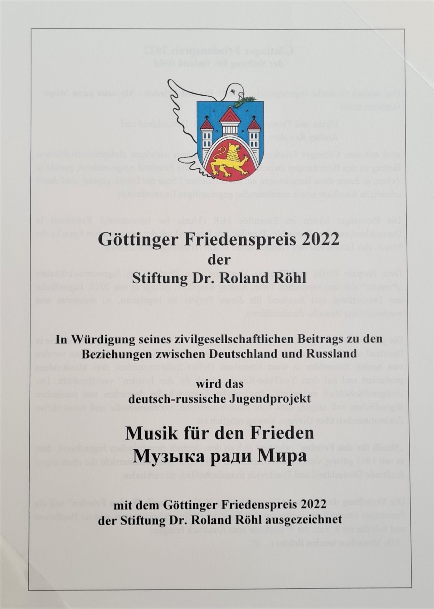 Prof. Dr. Götz Neuneck vorgenommen. Das war für alle Beteiligten ein besonderes Erlebnis! Unsere Partner aus Twer konnten an dem Konzert und der Verleihung teilnehmen, ein besonderes Zeichen für den Frieden in diesen konfliktreichen Zeiten mitten in Berlin!