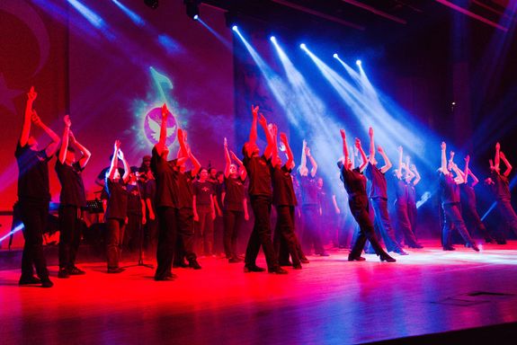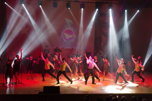 Zwei Stunden später kamen die restlichen Ensemblemitglieder zurück und machten sich mit den opulenten Umkleideräumen und der Bühne, die inzwischen auch mit einem Dance Floor ausgelegt war, vertraut. Auch für den Chor gab es einen Soundcheck. Darauf folgte ein Durchgang mit Kostümen und kurzen Unterbrechungen, um die Lichtstimmungen für die einzelnen Songnummern einzurichten. Anschließend kam auch das türkische Jugendorchester zum Zuge, um den gemeinsamen Song mit uns und ihre eigenen Stücke zu proben. Die zwei Stunden bis Konzertbeginn wurden für ein Abendessen und für intensive Gespräche mit Erasmus-Studenten aus aller Welt genutzt.